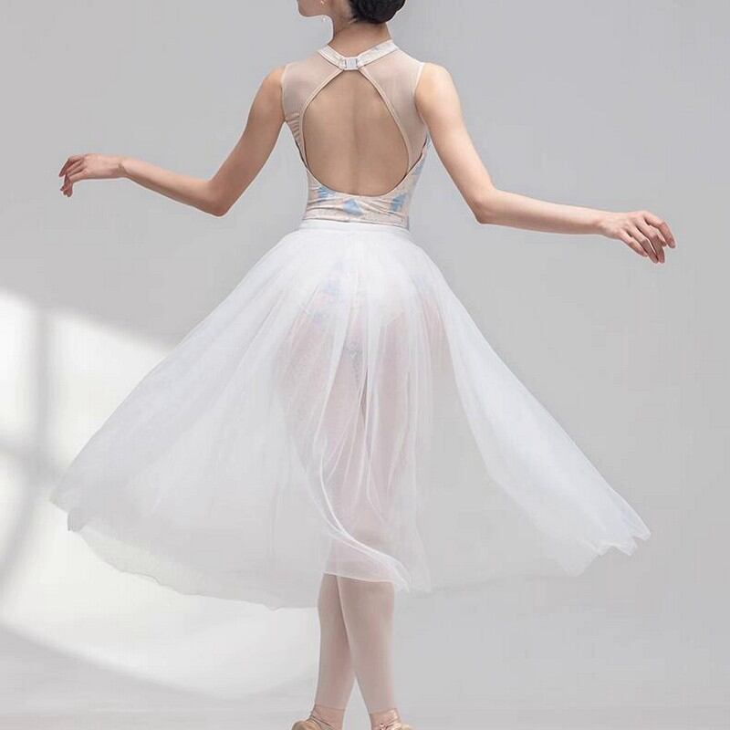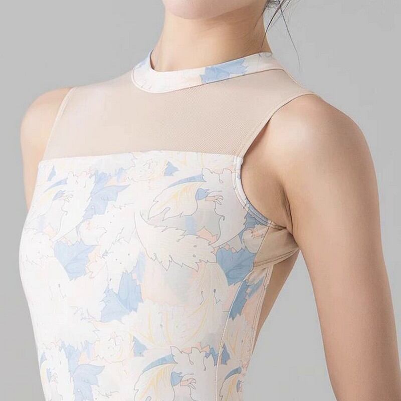 首元にチョーカーをつけているようなメッシュの胸元と大胆に開いた背面のデザインが特徴的。