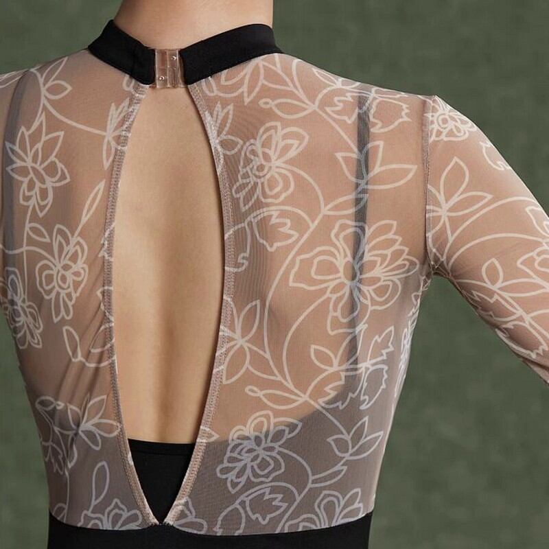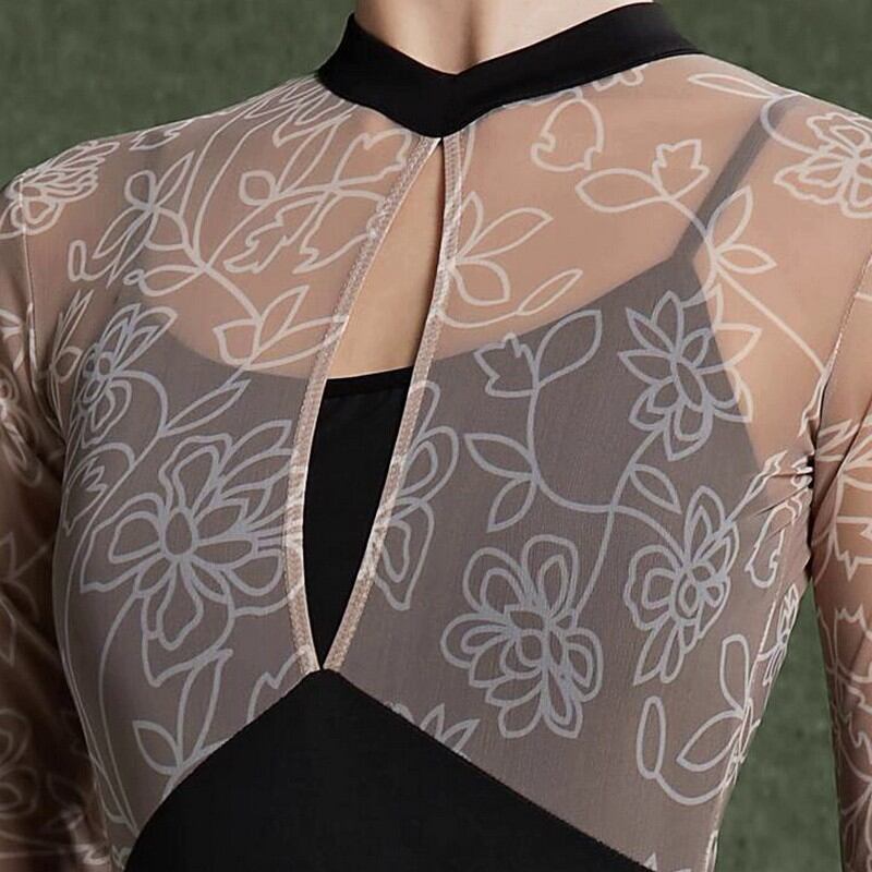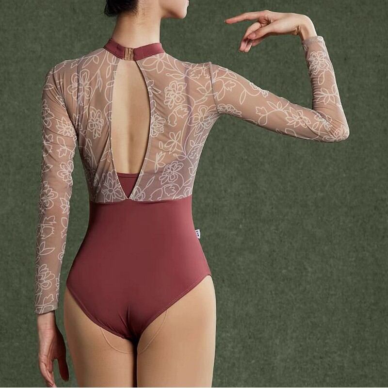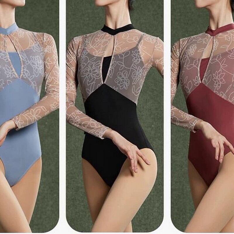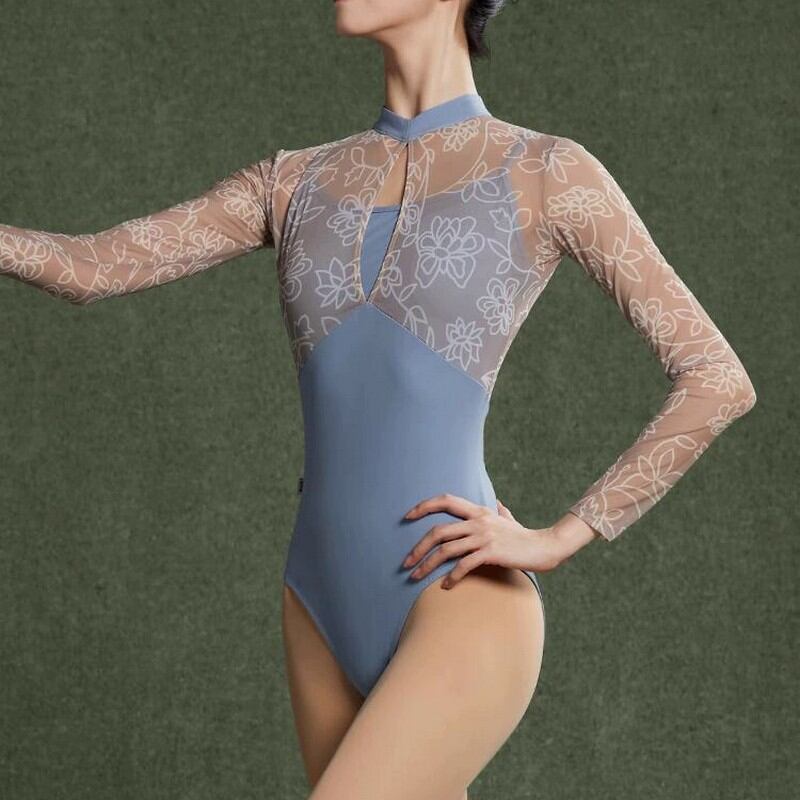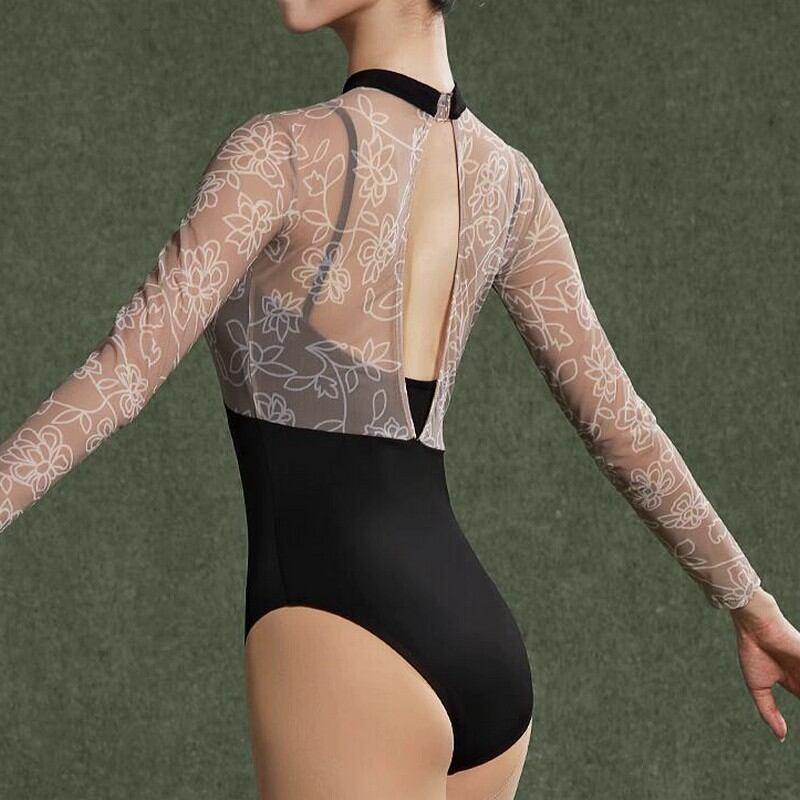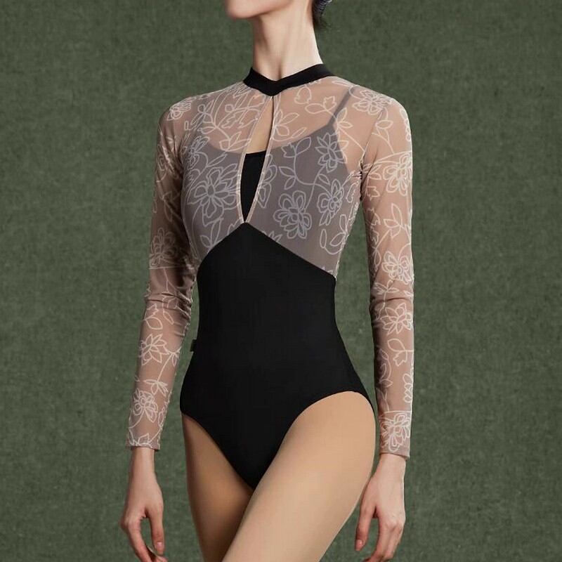ベーシックなキャミソールのレオタードにレイヤードしたようなシアーのロングスリーブをドッキングした一着。