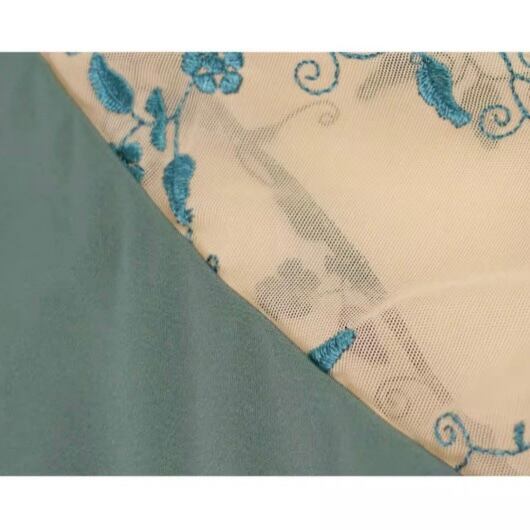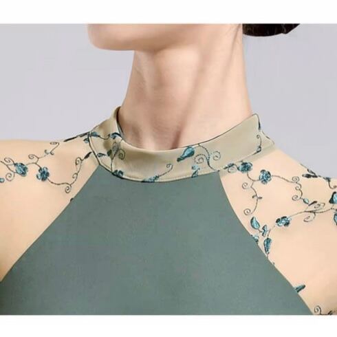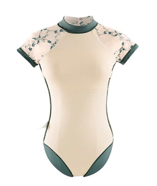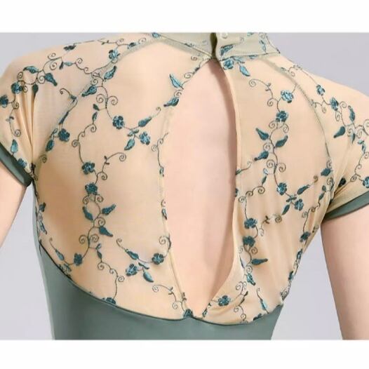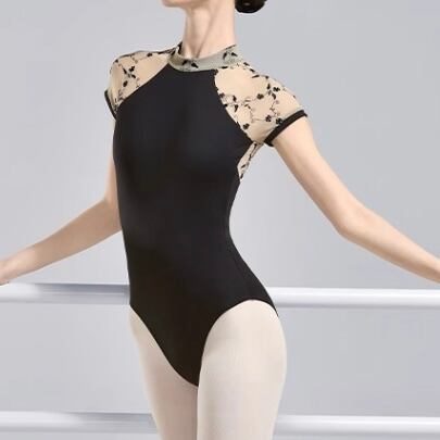 上品なハイネックと、エンブロイダリーレースの袖が魅力的なレオタードです。
