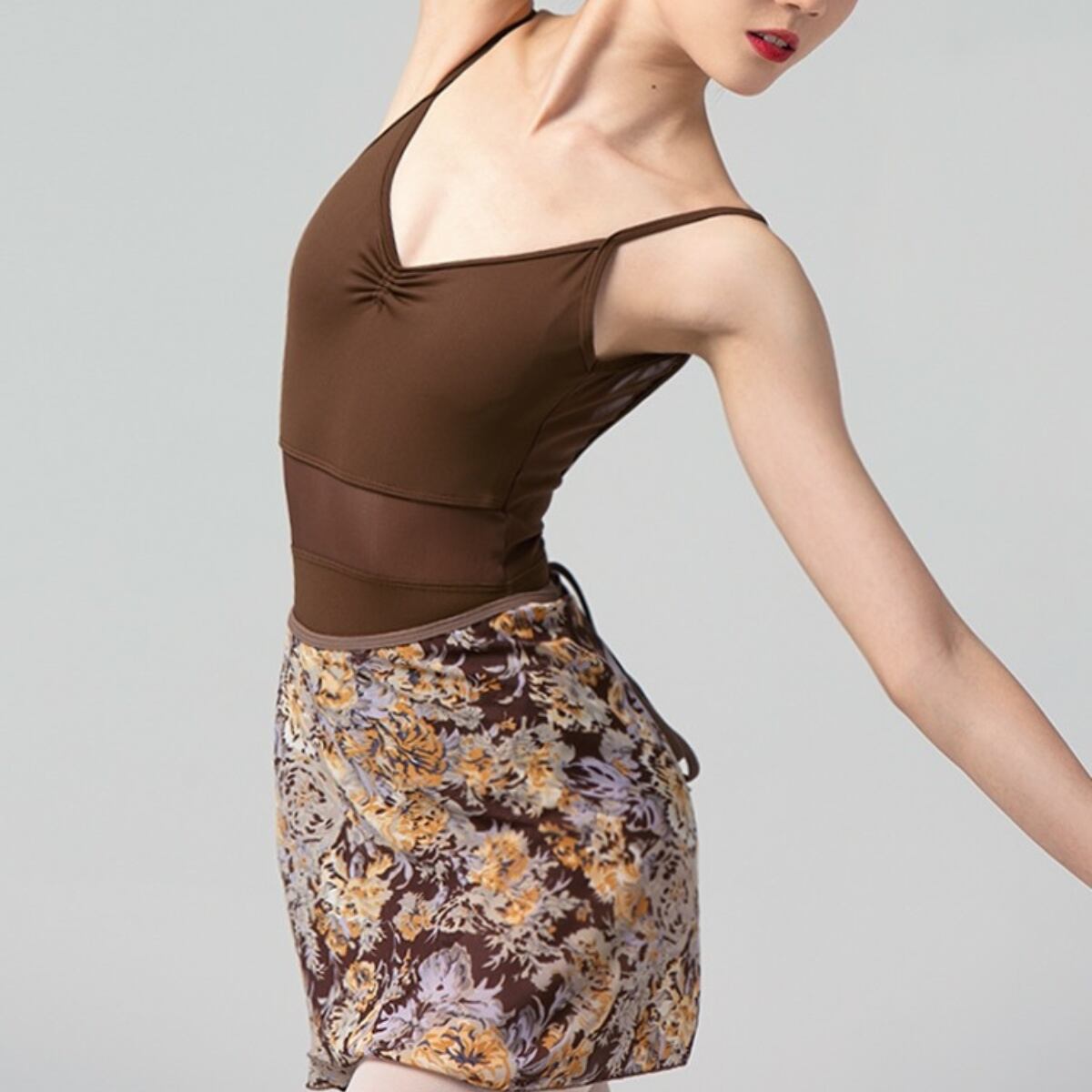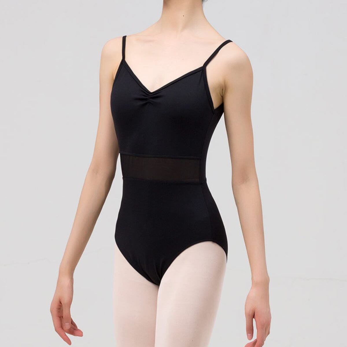 胸元から腕周りのラインを美しく魅せる、Vネックレオタード。