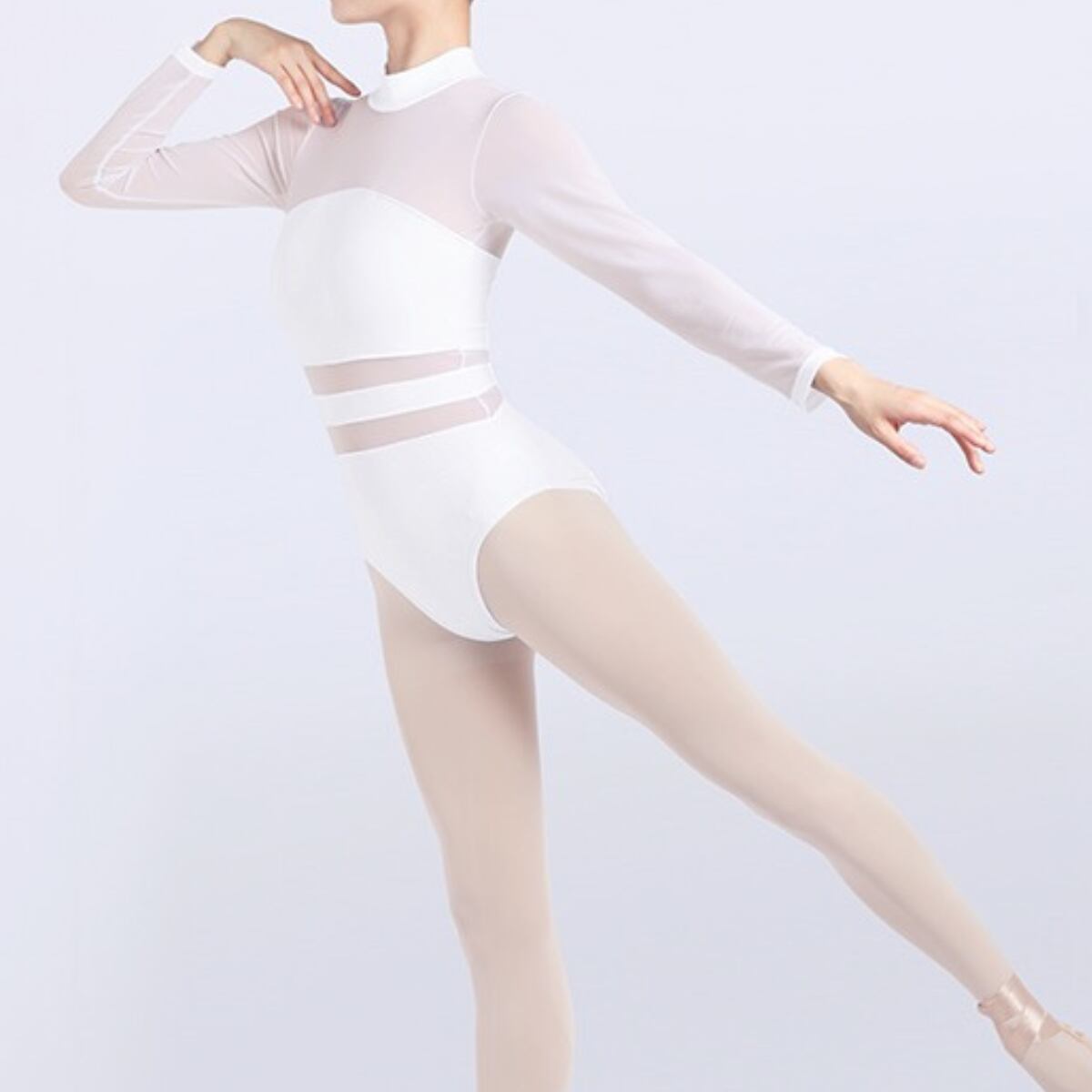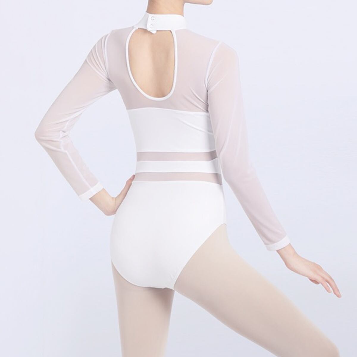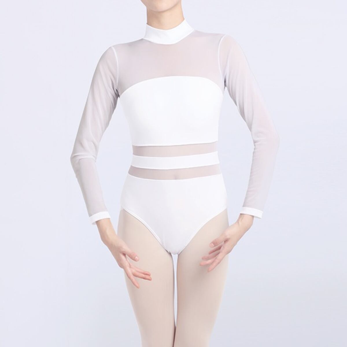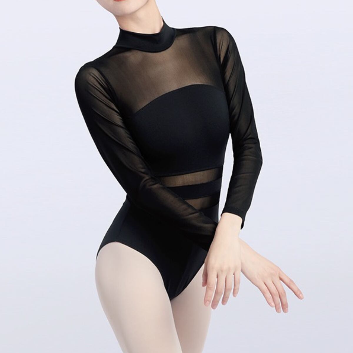 ボディラインを美しく魅せるシルエットと、メッシュ素材の切り替えがポイントのレオタード。ハイネックデザインが首元をすっきりと見せてくれます。