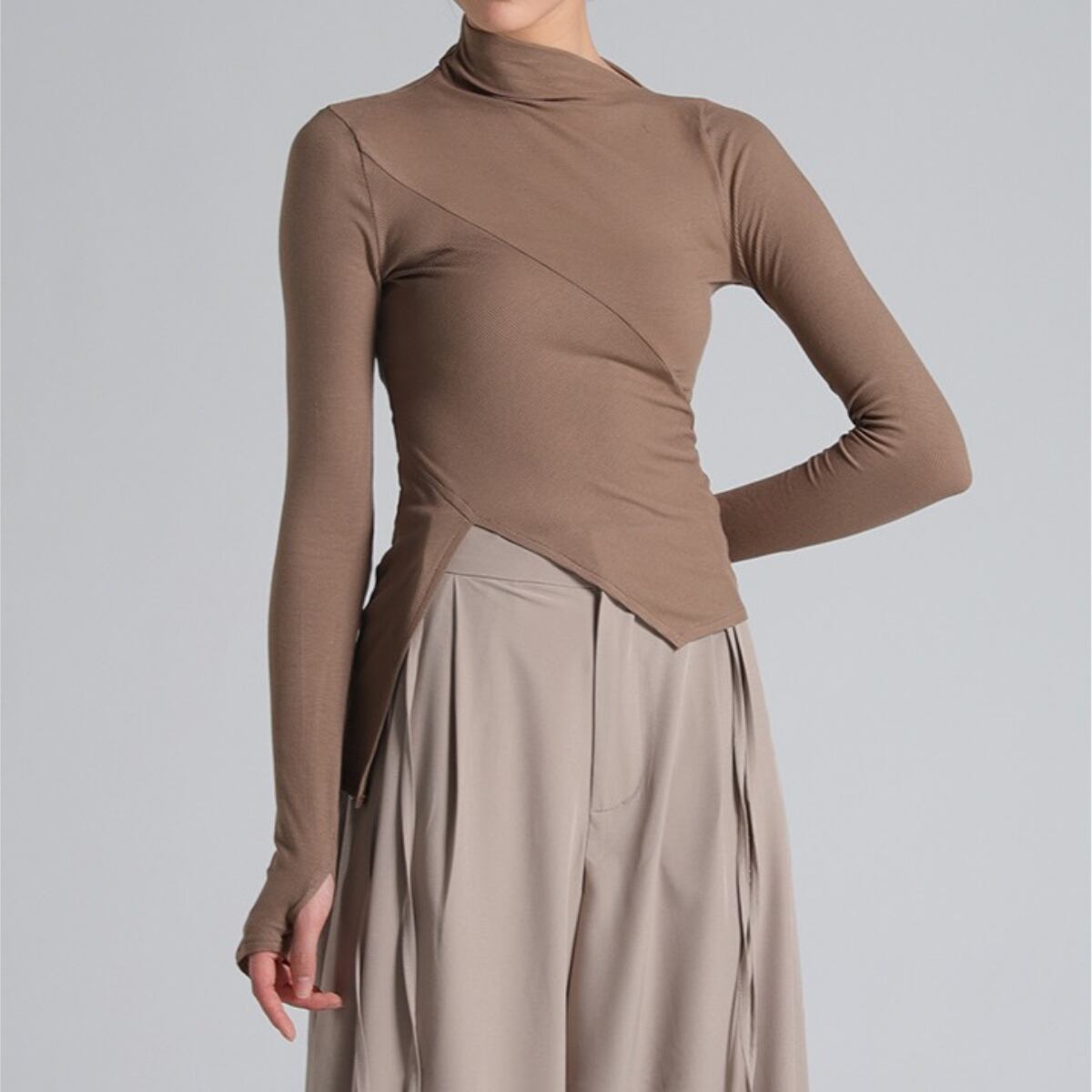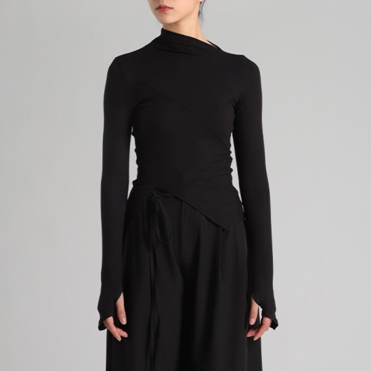 アシンメトリーなデザインが目を惹く、ハイネックロングスリーブニットトップス。