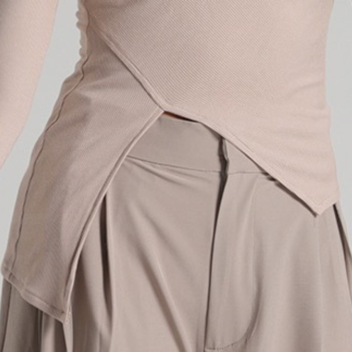 アシンメトリーな裾のデザインが、シンプルなコーディネートにアクセントを加えます。